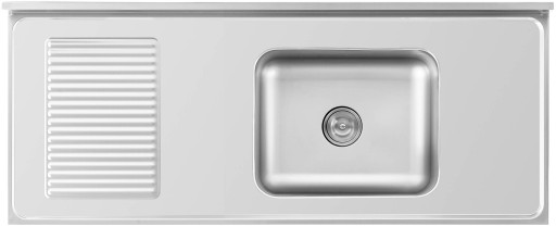 Zlew jednokomorowy o wymiarach 500 x 400 x 240 mm umieszczony został po prawej stronie szafki. Doskonale nadaje się do mycia głębokich garnków czy blach do pieczenia. Wysokie ścianki chronią przed zachlapaniem otoczenia. W odpływie umieszczono sitko, zapobiegające zatkaniu rur resztkami. Gładkie powierzchnie zapewniają łatwe utrzymanie w czystości. Zaokrąglone krawędzie szafkigwarantują bezpieczeństwo użytkowania. Rant o wysokości 100 mm chroni ścianę za meblem przez zabrudzeniem. Pod zlewem umieszczono dużą szafkę z przesuwnymi drzwiami, mieszczącą najpotrzebniejsze narzędzia kuchenne. Wysokość nóżek jest regulowana.