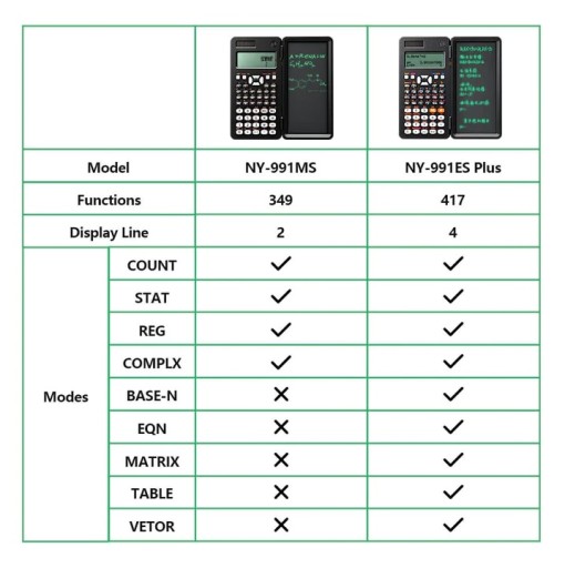 Poniżej jest tabela funkcji tego kalkulatora oraz wyższego modelu który też jest w naszej ofercie.