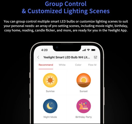 Z aplikacją Yeelight uzyskasz jeszcze więcej udogodnień. Poza zdalną obsługą oświetlenia możliwe jest także grupowe sterowanie wieloma inteligentnymi żarówkami LED oraz dostosowywanie scen do okazji. Planujesz noc filmową? A może organizujesz imprezę urodzinową? Masz ochotę na spokojny wieczór z książką? Wybierz dowolną scenę z wielu możliwości i ciesz się wymarzonym klimatem. Z żarówką Yeelight nie jest to niemożliwe!