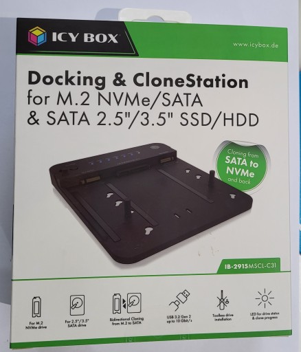 Opis produktu: ICY BOX - stacja dokująca HDD/SSD - funkcja klonowania - M.2 NVMe Card / SATA 6Gb/s - USB 3.2 (Gen 2)