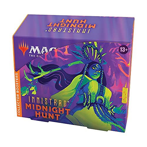 The Innistrad: Midnight Hunt Collector Booster Box contains 12 Innistrad: Midnight Hunt Collector Boosters. Each Collector Booster contains 15 Magic: The Gathering cards and 1 traditional foil double-sided token, with a combination of 5 Rares and/or Mythic Rares, 2–5 Uncommons, 4–7 Commons, and 1 Eternal Night Full-Art Basic Land card. Every pack includes a total of 10 traditional foil cards and a total of 8 cards with special treatments—with a combination of 2–3 Extended-Art cards, 3–5 Equinox Showcase cards, 1–3 Eternal Night Showcase cards (including Eternal Night basic land), and 0–2 Borderless cards.