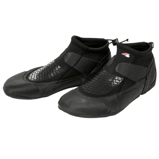 Neoprenowe buty windsurfingowe, z gumową podeszwą i gumowym wzmocnieniem cholewki, ze skrzydełkami pomagającymi stabilizować kostkę.