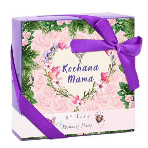 Piękny komplet 9 sztuk pachnących mydełek w kształcie róży, spakowane w ekskluzywne pudełko, przewiązane satynową fioletową wstążką, dodaje prezentowi wyjątkowego uroku. Idealnie sprawdzi się jako prezent na Dzień Mamy!