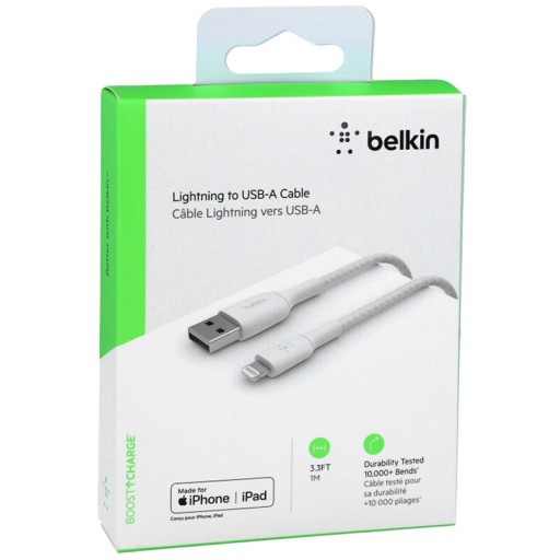 Wysokiej jakości pleciony przewód do ładowania i synchronizacji Apple iPhone/iPad/iPod z certyfikatem Made For iPhone od marki Belkin.
