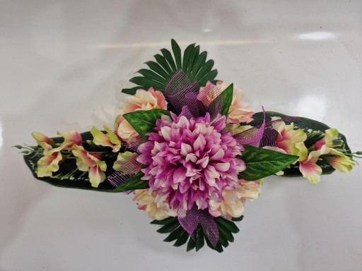 Stroik wykonany z kwiatów sztucznych na donicy zalanej betonem.