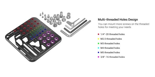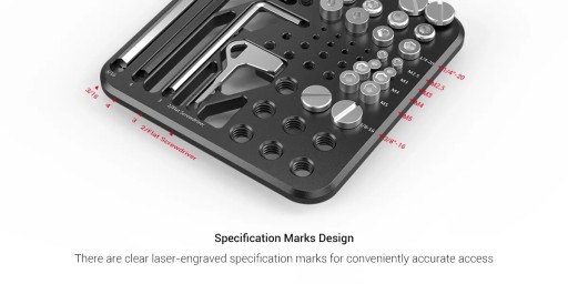 Płytka do przechowywania śrub i kluczy sześciokątnych SmallRig MD3184 jest przeznaczona do powszechnie używanych śrub i kluczy sześciokątnych w zestawach kamer. Jest to płyta do przechowywania zawierająca 4 klucze sześciokątne (3/16, 3, 4, 2/śrubokręt płaski) i różne śruby, takie jak 2 śruby z łbem płaskim 1/4”-20, śruby sześciokątne 8 1/4”-20 do klatek, Wsporniki L, płytki QR, podstawy, uchwyty, zaciski prętowe, płyty górne i monitory, 2 śruby sześciokątne M4 i 2 M5, 2 śruby z łbem trymowanym M3 do montażu rozet, 2 śruby sześciokątne M2,5 stosowane do zabezpieczenia klatki przed skręcaniem oraz 2 3 Śruby z łbem płaskim /8”-16 do płytek QR i płyt bazowych. Zapewnia zabezpieczenie przed upadkiem, przytrzymując klucze sześciokątne za pomocą magnesu i montując śruby w gwintowanych otworach. Wyraźne, wygrawerowane laserowo oznaczenia specyfikacji zapewniają wygodny i dokładny dostęp. Płytka do przechowywania jest wyposażona w flanelę i otwór na pasek ułatwiający przechowywanie i przenoszenie.