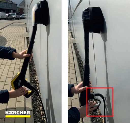 - Kärcher - dłuższy pistolet wpływa na ergonomię pracy, pozwala czyścić w trudno dostępnych miejscach oraz np. chodnik bez schylania.