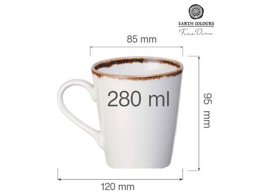 Kubek Vanilla Fine Dine. Kubek do kawy, herbaty, wykonany z wysokiej jakości porcelany. Kremowy kubek z brązowym rantem. Mocny, solidnie szkliwiony, wzmocniony na brzegach - kubek do domu i gastronomii. Materiał: porcelana Kolor: kremowy, brązowy Pojemność użytkowa: 250 ml Pojemność maksymalna: 280 ml Średnica: 8,5 cm Wysokość: 9,5 cm Zmywarka, mikrofala: tak Kod producenta: 781487
