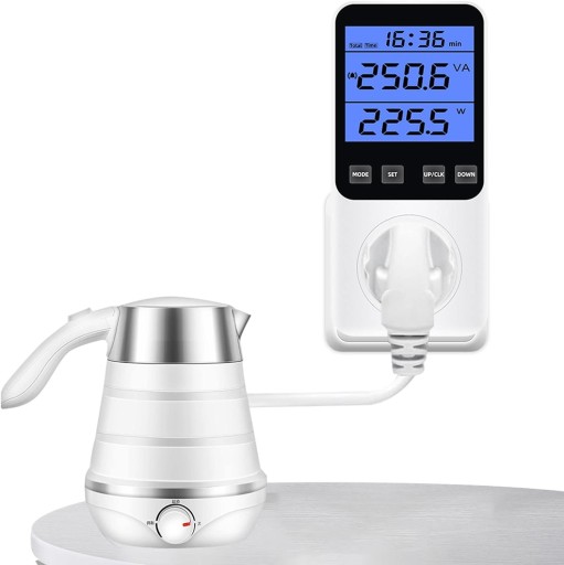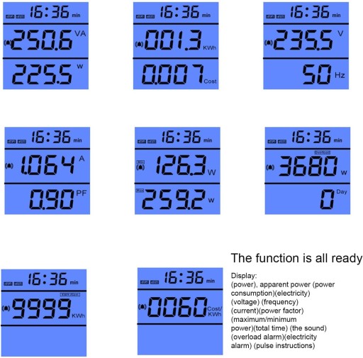 - * 14 trybów pomiaru: pomiar zużycia energii (W), moc pozorna (VA), zużycie energii, rachunek za moc, napięcie (V), częstotliwość (Hz), natężenie prądu (A), współczynnik mocy (PF), moc maksymalna/min, skumulowany czas (kWh), dźwięk klucza, alarm przeciążenia, alarm zużycia energii, wskaźnik pulsu i stan każdego rachunku za prąd. (Nie liczy się w trybie czuwania) Idealny pomocnik w domu, aby zaoszczędzić energię elektryczną i pieniądze.