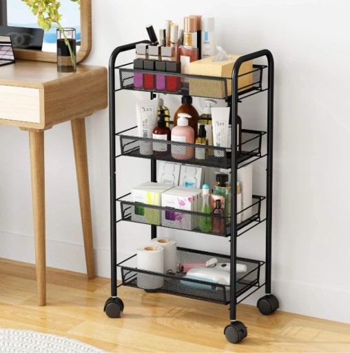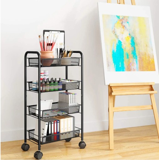 Regał mobilny w kolorze czarnym na kółkach, to prosty i praktyczny dodatek do Twojego domu! Pozwoli Ci zorganizować przestrzeń oraz oszczędzić miejsce w szafkach. Sprawdzi się w każdym pomieszczeniu, w którym potrzebujesz dodatkowej przestrzeni, dzięki swojemu estetycznemu wyglądowi, postawisz go w kuchni, salonie, sypialni czy łazience, idealnie sprawdzi się również do salonu kosmetycznego. Odsłonięte półki sprawią, ze będziesz miał szybki dostęp do niezbędnych rzeczy, a kółka pozwolą Ci z łatwością zmienić jego miejsce, bez zbędnego używania siły!