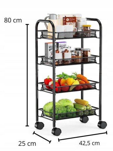 МОБИЛЬНАЯ ПОЛКА НА КОЛЕСАХ КУХОННАЯ ТЕЛЕЖКА 4 ПОЛКИ ЧЕРНАЯ ДЛЯ КУХНИ 42,5х25х80