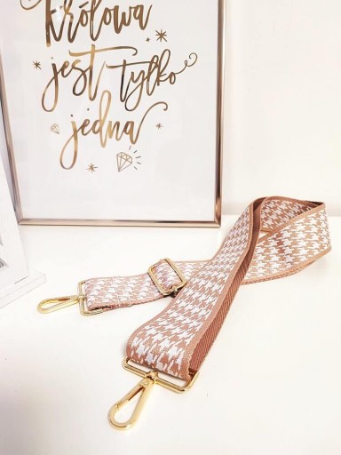 Широкий ремешок для сумки в бело-розовый узор с узором «гусиные лапки» и золотом.