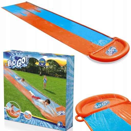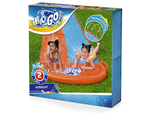 - Podwójny ślizg wodny H2O GO! zjeżdżalnia to zdecydowany ulubieniec letnich zabaw na świeżym powietrzu. Ślizgawka posiada podwójny tor o długości aż 488 cm, nawadniany poprzez podłączenie ogrodowego węża do natrysków umieszczonych w zjeżdżalni.