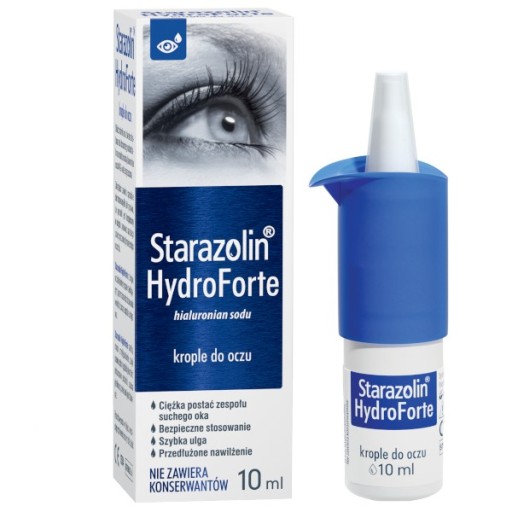 Krople do oczu Starazolin HydroForte to intensywnie nawilżający wyrób medyczny skierowany do osób z zespołem suchego oka, objawiającym się między innymi: suchością, uczuciem podrażnienia czy piasku pod powiekami. Starazolin HydroForte nie zawiera konserwantów, a po otwarciu można go stosować przez 180 dni.