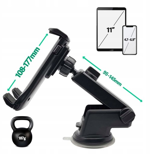 - Jakie urządzenia są kompatybilne z uchwytem? Uchwyt jest kompatybilny z urządzeniami o szerokości/ wysokości od 108 do 177mm (urządzenie może być montowane w pionie oraz poziomie), dzięki czemu z łatwością pomieści zarówno smartfony od 4.7 cali, jak również tablety o wielkości ekranu do 11 cali.