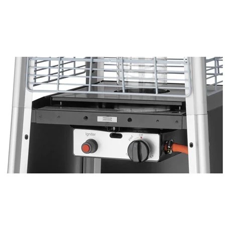Gazowy parasol grzewczy przeznaczony do użytku na zewnątrz pomieszczeń.