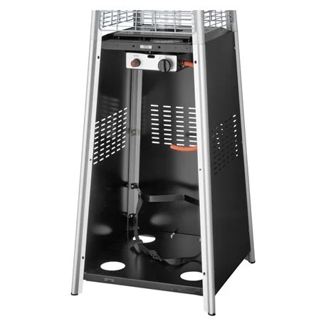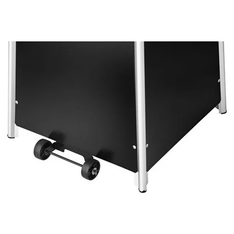 Tarasowy ogrzewacz jest wyposażony w kółka ułatwiające jego przemieszczanie w razie potrzeby.