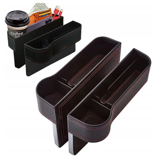 Samochodowy schowek szczelinowy z przegródkami i uchwytem na kubek przeznaczony do montażu z prawej strony pomiędzy fotelem kierowcy, a skrzynią biegów.