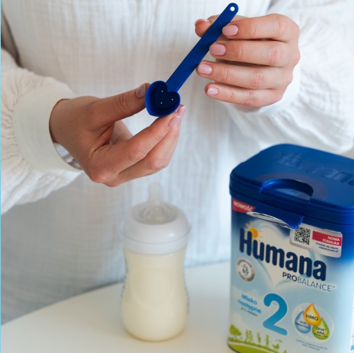 PRZYGOTOWANIE: Przegotowaną wodę wystudź do temperatury 50°C oraz wlej mniej więcej połowę objętości wody do czystej butelki. Luźno napełnij załączoną miarkę Humana i wyrównaj nadmiar proszku wygodną wewnętrzną krawędzią opakowania. Odmierz do butelki odpowiednią ilość miarek. Zamknij butelkę i energicznie wstrząśnij, następnie dodaj pozostałą objętość wody i ponownie wstrząśnij do całkowitego rozpuszczenia proszku. Nałóż smoczek na butelkę oraz sprawdź temperaturę przygotowanego mleka (37°C).