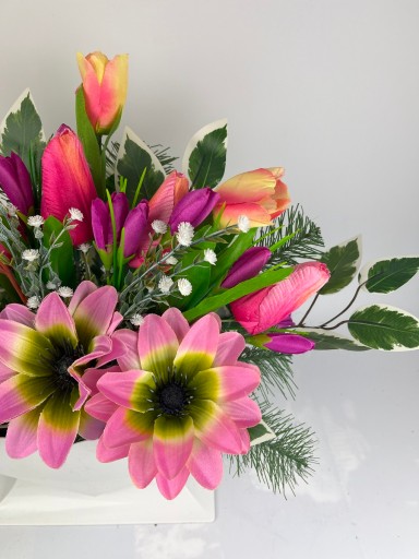 KOMPOZYCJA SZTUCZNA WIELKANOCNA NA GRÓB W OZDOBNEJ DONICY