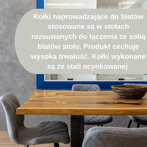 Kołki naprowadzające do blatów stosowane są w stołach rozsuwanych do łączenia ze sobą blatów stołu. Produkt cechuje wysoka trwałość. Kołki wykonane są ze stali ocynkowanej.
