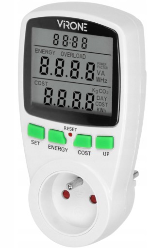 - Miernik mierzy pobieraną energię oraz oblicza jej koszt, podaje zużycie CO2 dla kontrolowanych urządzeń.