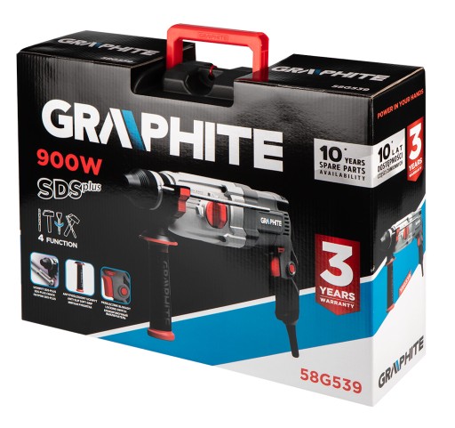 Młotowiertarka SDS+ 900 W, 3,4J, walizka 58G539 marki GRAPHITE to specjalistyczne narzędzie SDS+ o mocy 900 W, posiadające funkcje wiercenia oraz wiercenia z udarem pneumatycznym. Umożliwia wykonanie otworów do 28 mm średnicy w betonie i cegle, 13 mm w stali oraz 30 mm w drewnie. Narzędzie posiada funkcje zmiany kierunku obrotu wrzeciona, stopniowej regulacji prędkości i blokadę włącznika do pracy ciągłej. Podczas wiercenia młotowiertarka osiąga do 950 obrotów na minutę, a po przełączeniu na udar (funkcja udaru uruchamia się w trakcie docisku wiertła do powierzchni wierconej) – do 5300 uderzeń na minutę. Energia udaru w narzędziu wynosi 3,4 J. Wygodna funkcja ,,click” przeznaczona jest do szybkiego mocowania wiertła. Komfortowa rękojeść główna narzędzia pokryta jest antypoślizgową nakładką, dobrze więc leży w dłoni. W zestawie znajdują się: dodatkowe wiertła, uchwyt wiertarski, adapter do uchwytu, listwa ogranicznika głębokości wiercenia, obrotowa rękojeść dodatkowa, zasobnik ze smarem oraz walizka transportowa. Urządzenie wyposażone jest w elastyczny i trwały przewód zasilający w powłoce gumowej o długości 3 m, dedykowany także do zastosowań profesjonalnych i przemysłowych, zarówno wewnątrz jak i na zewnątrz pomieszczeń. Zgodność z europejskimi standardami zapewnia certyfikat CE.