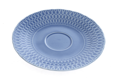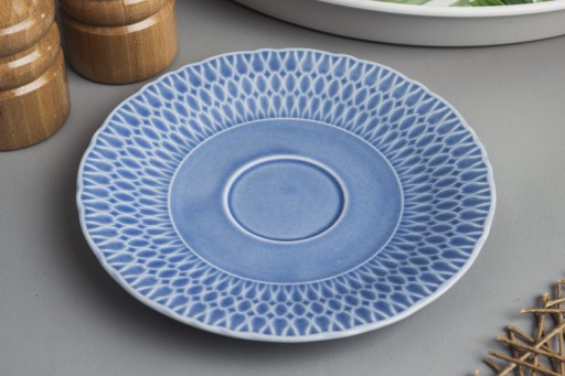 Spodek pod filiżankę, wykonany z wysokiej jakości polskiej porcelany metodą kolorowego szkliwienia. Praktyczny i stylowy, w oryginalnym niebieskim kolorze z tłoczonym wzorem. Idealny do serwowania kawy lub herbaty.