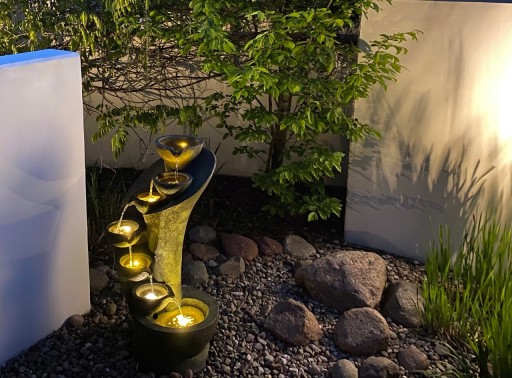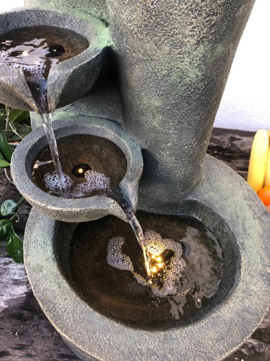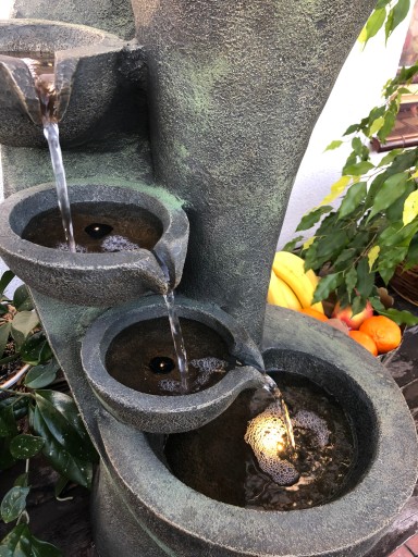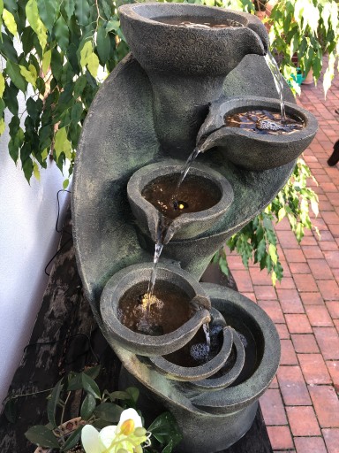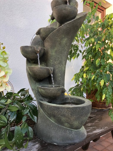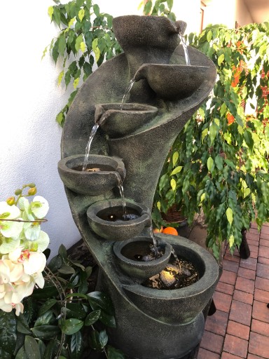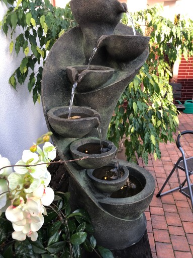 Fontanna w obiegu zamkniętym, woda w dolnym zbiorniku pompowana do górnego naczynia skąd kaskadowo – pod wpływem grawitacji spływa w dół …….. tu tego nie słychać ale jest to miłe i przyjemne doznanie zamykające oczy – można odczuć wrażenie przebywania blisko naturalnego strumienia ,