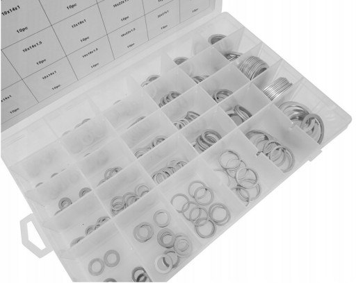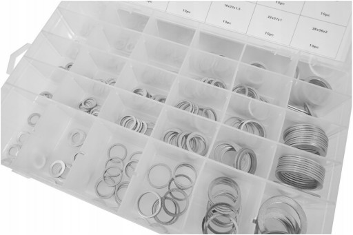 Zestaw 300 sztuk podkładek aluminiowych pod korki spustowe oleju marki VERKE. Przydatne w każdym warsztacie samochodowym. Całość zapakowana w poręczne plastikowe pudełko z przegrodami zapewniającymi porządek i prawidłową segregację rozmiarów.