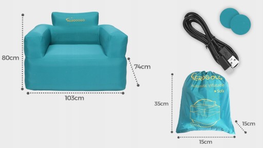 - Jedno pełne naładowanie umożliwia 12-krotne napompowanie tej jednoosobowej sofy