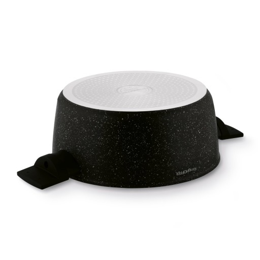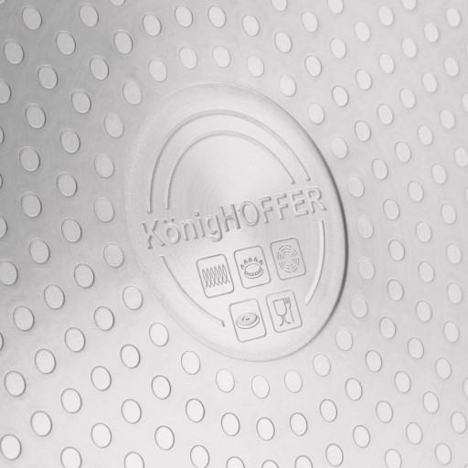 Zestaw garnków Konighoffer Brazos 10 elementów wykorzystuje powłokę non-stick ułatwiającą pielęgnację (nie do zmywarki, tylko mycie ręczne). Komplet jest solidny i pozwala na bezpieczne gotowanie oraz smażenie, zmniejszając ryzyko oparzenia dłoni. W zestawie znajdziesz naczynia o pojemności od 1,2 do 6,5 litra. Do garnków dołączono szklane pokrywki ze stalowym rantem, chroniącym przed wyszczerbieniem. Mają one również stylowe uchwyty soft touch, które się nie nagrzewają i nie ślizgają w dłoni. Z kompletem garnków i 2 patelni Brazos możesz gotować na każdym typie kuchenki. Elegancji dodaje mu marmurowa powłoka nieprzywierająca, która wytrzyma wiele cykli ścierania (5000!) oraz wykończenie aluminiowych korpusów kutych w wysokiej temperaturze. Nagrzewają się szybko, a więc oszczędzisz czas i energię. Świetnie sprawdzą się w rodzinnej kuchni lub jako prezent. Są też dobrze zabezpieczone przed wysoką temperaturą i równomiernie przewodzą ciepło. Zapewniają pewny chwyt podczas przenoszenia. O ich bezpieczeństwie użytkowania oraz nietoksycznej konstrukcji dla środowiska stanowi oznaczenie PFOA Free.