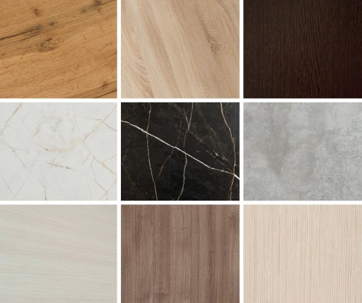Materiał podstawy – stal malowana na czarna. Blat jest wykonany z płyty obustronnie laminowanej o grubości 44 mm (22+22). Górna część - w kolorze dąb wotan.