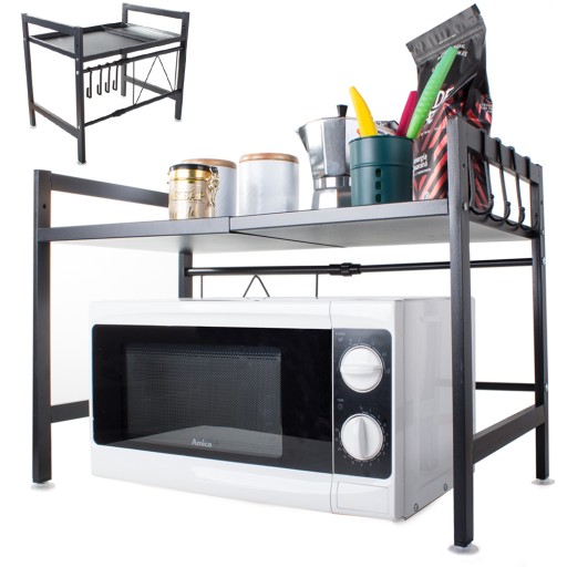 Regulowana półka kuchenna na mikrofalę, pozwoli zaoszczędzić dużo miejsca w kuchni. Dzięki temu można wygospodarować dodatkową przestrzeń na przechowanie przypraw jak również innych sprzętów kuchennych, np: czajnika, kawiarki, tostera, drugiej mikrofalówki itp.