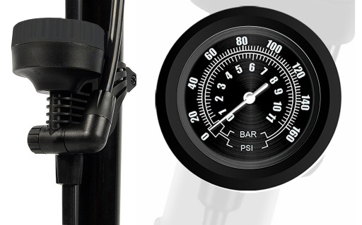 - Pompka posiada wbudowany manometr wyskalowany do 11 BAR / 160 PSI, co pozwala na bieżące kontrolowanie i uzyskanie pożądanego ciśnienia!