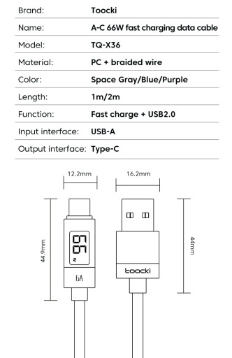 Uniwersalny, szybki kabel TOOCKI 2 metry 66W to niezawodne akcesorium do ekspresowego ładowania urządzeń oraz transmisji danych. Model ten dysponuje wtykami USB-A oraz USB-C, posiada inteligentny system elektronicznych zabezpieczeń najnowszej generacji, który automatycznie dobiera parametry techniczne prądu, które będą odpowiednie dla ładowanego urządzenia.