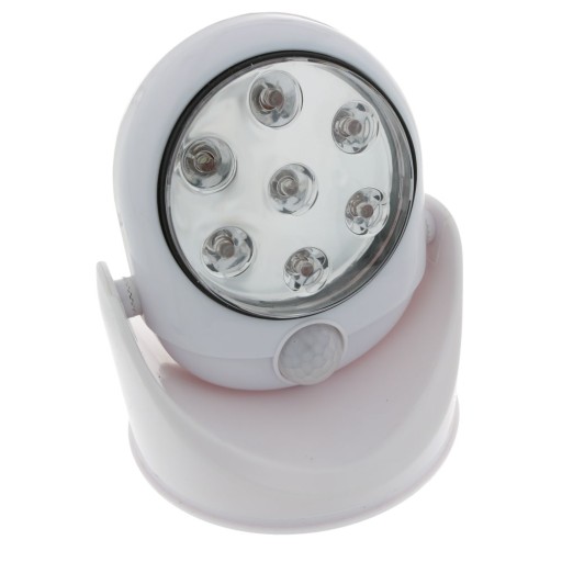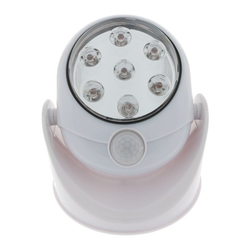 Bezpieczna lampka led oświetlająca przestrzeń na zewnątrz i wewnątrz 7 diod regulacja kąta nachylenia obrotowa włącznik zasilana bateriami zestaw do montażu na schody nad wejście do garażu piwnicy w łazience składziku. Lampka 7led czujnik.
