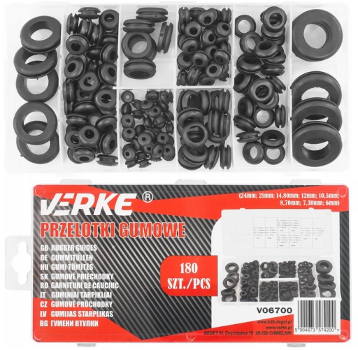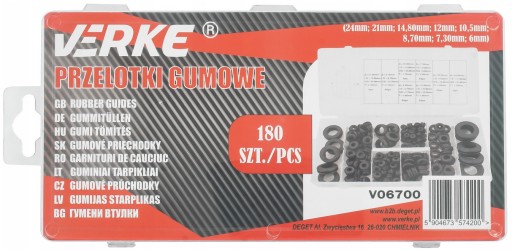 Przelotki gumowe marki VERKE, umieszczone w wygodnym opakowaniu typu "sortownik".
