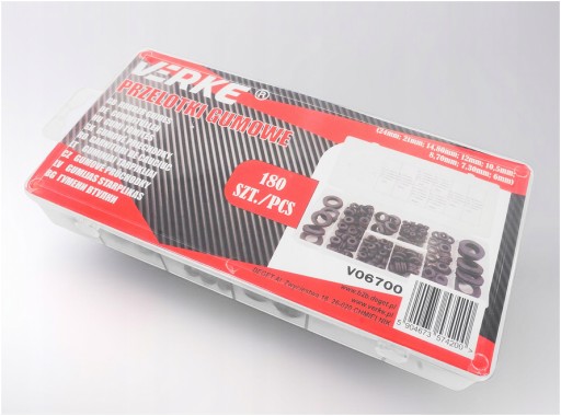 Zestaw przelotek gumowych zapakowany w praktyczne wygodne pudełko umożliwiające porządkowanie przelotek według ich rozmiarów. Pełen wykaz rozmiarów uszczelek znajdujących się w zestawie umieszczony jest na opakowaniu.