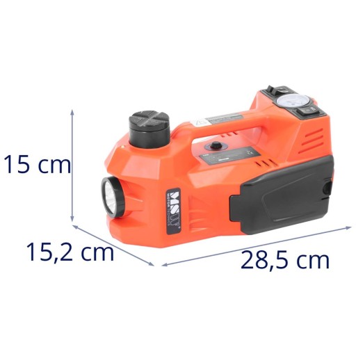 - Wydajność – elektryczny podnośnik samochodowy z różnymi narzędziami do podnoszenia, pompowania i serwisowania kół w przypadku awarii + lampa LED