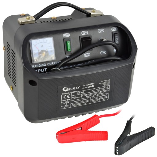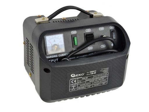 Prostownik samochodowy 12/24V CB-40 Prostownik samochodowy CB-40 przeznaczony do ładowania akumulatorów ołowiowo-kwasowych(STD) o napięciu 12V lub 24V , stosowanych m. in. w samochodach osobowych, dostawczych, ciężarowych itp. Posiada wbudowany bezpiecznik, który chroni urządzenie przed nieprawidłowym podłączeniem biegunów i zwarciem. Cechy produktu: starannie wykonany ergonomiczny uchwyt do przenoszenia posiada wbudowany bezpiecznik 30A typu UNI, oraz bezpiecznik topikowy 5A ładuje akumulatory o pojemności od 92 do 300 Ah napięcie ładowania 12V / 24V Specyfikacja techniczna: Napięcie zasilania: 230V / 50 Hz Napięcie ładowania: 12 / 24V Prąd ładowania: 20A – 30A Pojemność obsługiwanych akumulatorów: 92 - 300 Ah Stopień ochrony: IP 21 Zabezpieczenia: Bezpiecznik 30A typu UNI, bezpiecznik topikowy 5A Wyposażenie: kable rozruchowe, 2x bezpiecznik typu UNI, 2x bezpiecznik topikowy