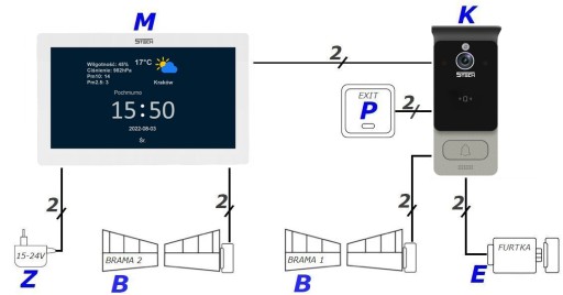 - Najnowsze dwużyłowe rozwiązanie sprawdzi się tam gdzie mamy ograniczoną ilość przewodów. Całość łączymy dwiema żyłami pomiędzy monitorem a stacją zewnętrzną.