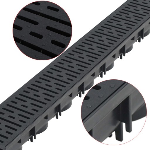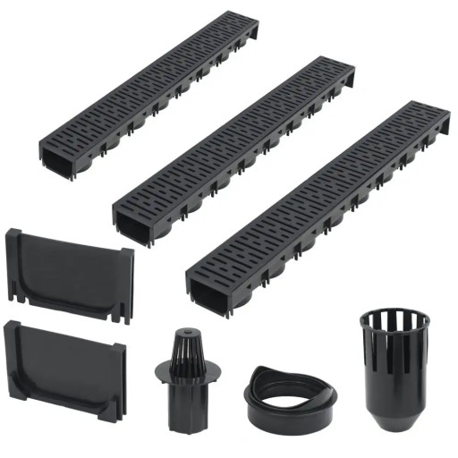 Ten kompletny zestaw składa się z 3 kanałów odpływowych z plastikowymi kratkami, 1 systemu filtracyjnego, 1 złącza dolnego odpływu i 2 zatyczek. Stanowi idealne rozwiązanie dla zbierania i odprowadzania nadmiaru wody z podjazdów, podwórek i innych przestrzeni na zewnątrz.