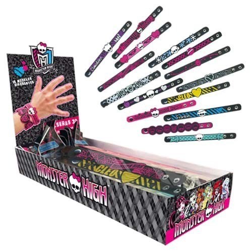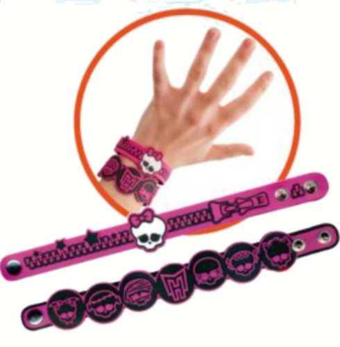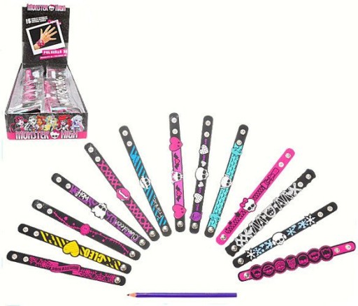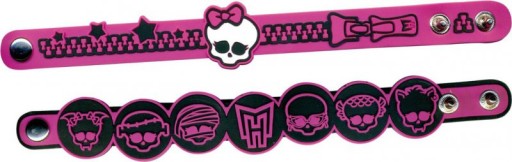 Prezentujemy niesamowite bransoletki 3D (z pogrubionymi wzorkami) w różnych kolorach, ozdobione napisami, czaszkami Monster High oraz logo bajki. Zapinane są na dwa zatrzaski - umieszczone wzdłuż bransoletki, jeden za drugim, umożliwiają jej regulację.