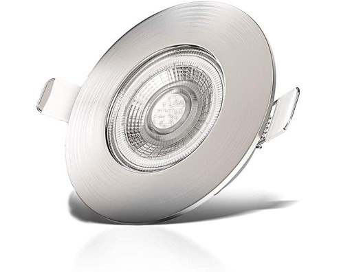 Oprawka wpustowa - Downlight - w lampie zastosowano wysokiej jakość moduł LED o mocy 5W i barwie światła ciepłej 3000k dzięki któremu głębokość montażowa zmniejszyła się do zaledwie 3 cm. Oprawka w kolorze nikiel mat. Dodatkowym atutem jest to że oprawa może być stosowana w łazience dzięki IP44 oraz możliwość stosowania ze ściemniaczem