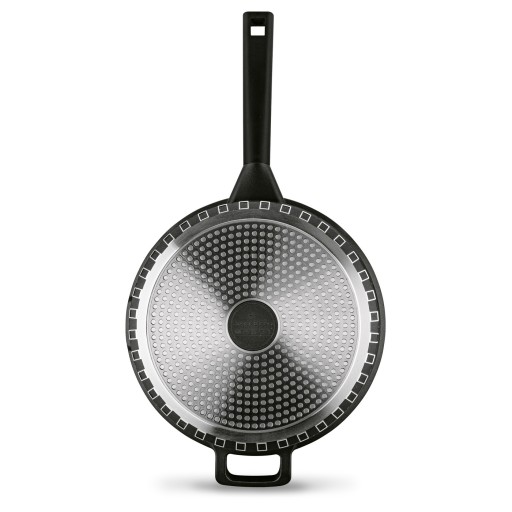 Pozostałe informacje: - patelnia aluminiowa, odlewana, - pokryta powłoką Greblon C3, - powłoka trójwarstwowa, - 8000 cykli ścierania, - grubość powłoki: 40- 45 um, - grubość brzegu: 7 mm, - grubość ścianki: 2,3 mm, - grubość dna: 4,5 mm, - PFOA free, - pokrywa szklana ze stalowym rantem i odpowietrznikiem, - uchwyt pokrywy i patelni bakelitowy typu soft touch, przykręcany, - 5 lat gwarancji, - produkt przeznaczony do mycia ręcznego