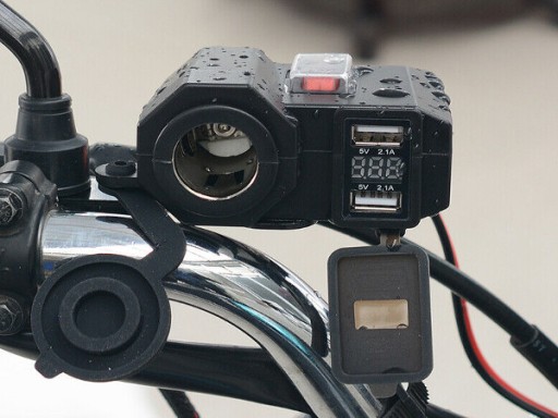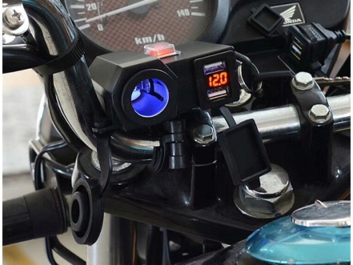 Wodoodporne gniazdo zapalniczki do motocykla, skutera, quada. Wyposażone w woltomierz pokazujący napięcie ładowania akumulatora. Dodatkowo dwa mocne porty USB 5V 2.1A