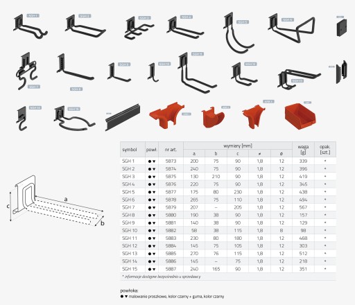 Każdy z haków dysponuje specjalnym zaczepem umożliwiający jego szybki montaż i demontaż. W celu przedłużenia można połączyć łącznikiem SGL oraz krawędzie zakończyć maskownicami SGM. Wieszaki dostępne są również w naszej ofercie. Wykonano je ze stali, a elementy mające bezpośredni kontakt z zawieszanymi przedmiotami wykończono gumową powłoką, która chroni przed zarysowaniem. Dostępne rozmiary i formy wieszaków pomagają wygodnie przechowywać wiele narzędzi i sprzętów w sposób zapewniający szybki do nich dostęp. Wszystkie elementy systemu GOLIAT dostępne są w naszej sprzedaży.