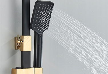 Prysznicowy zestaw złoto-czarnej baterii łazienkowej wyposażony jest w deszczownicę umieszczoną nad głową użytkownika. Woda wypływająca z kwadratowej deszczownicy przyjmuje formę dżdżu przyjemnie zraszającego głowę i ciało. Daje wrażenie masażu i pozwala na niesamowite doznania relaksacyjne