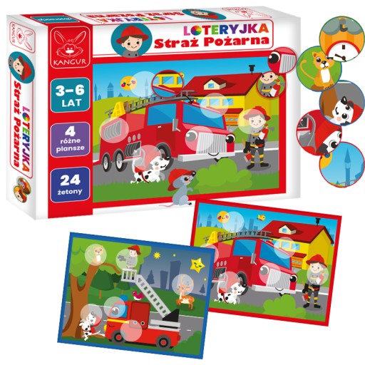 Jedna z pierwszych gier proponowana dla małych dzieci w wieku od 3 lat. Poznawanie pracy Straży Pożarnej to wspaniała przygoda. Gra zawiera cztery kolorowe ilustracje oraz przygotowane specjalnie do nich 24 żetony. Maluchy układają i odkrywają świat. Dziecko odszukuje odpowiednie miejsce dla żetonu. Układa i widzi całą ilustrację.